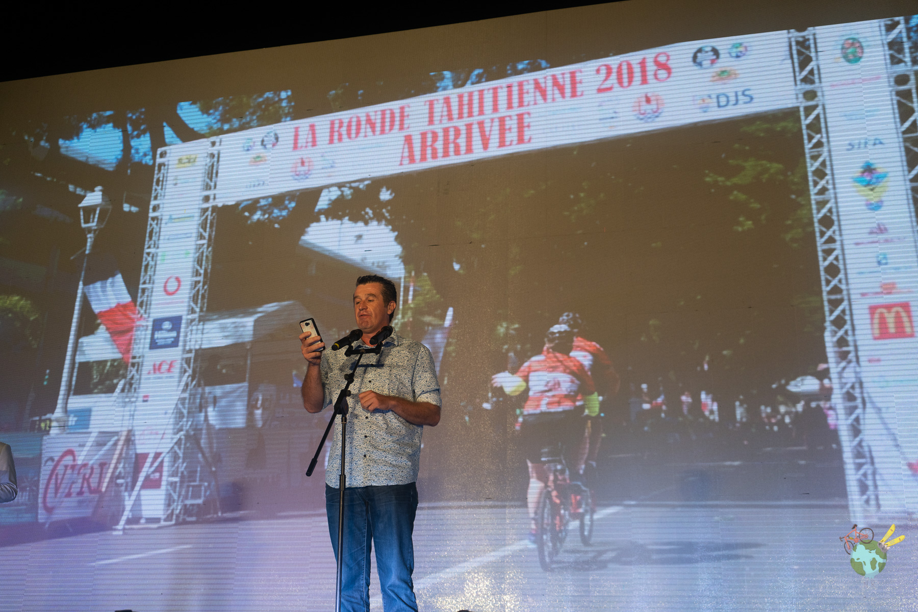 Face à des milliers de personnes, Benoit Rivals de la Ronde Tahitienne, Davide Cassani pour In Emilia Romagna présentent leurs évènements avec en toile de fond, un écran géant ajoutant des images aux discours.