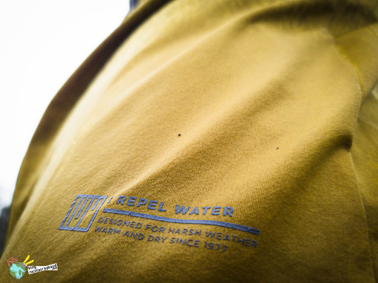 La veste fait parfaitement le travail sous la pluie et face au vent. Son imperméabilité se situe dans le standard du marché avec une résistance à 10 mètres de colonne d’eau (10 000 Schmerber) et une respirabilité de 10 000 MVP (lire mon dossier sur l’imperméabilité des vêtements).
