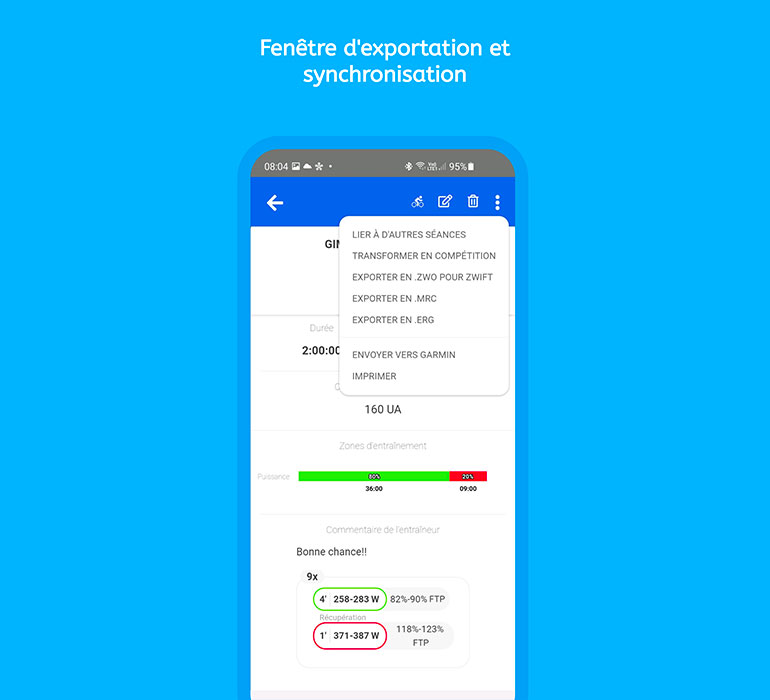 La synchronisation automatique des séances structurées vers Zwift n’est pas encore disponible Vous devez télécharger votre séance au format .zwo et l’ajouter dans votre dossier Zwift.