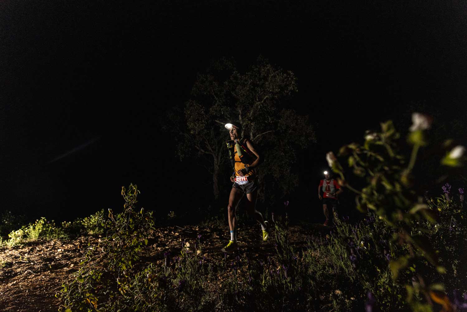 Le soleil n’est pas encore levé et dès le départ, je m’échappe facilement seul en tête. Nicolas Lebrun est là pour me rappeler ” la journée vas être longue !“. Nos foulées éclairées seulement par les frontales, je part à une conquête confiante de l’inconnu. Je suis seule en tête pendant près de 20 km. Les concurrents ne sont pas loin et je ressens que ma course à l’avant les motive à rattraper !