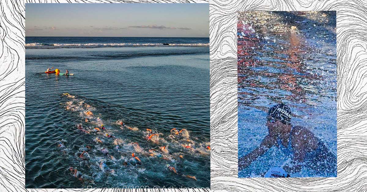 Le parcours du 0-3000 est unique en son genre. Le départ à lieu à 6h du matin dans le lagon de Saint-Pierre. Il faut se lever tôt pour placer son vélo. Nous profitons d’une agréable sensation de douceur à mesure que le soleil se lève. Les départs se suivent en 3 vagues distinctes séparés de 15 minutes. Les triathlon s’élance dans la première vague, suivis du duathlon puis des relais.