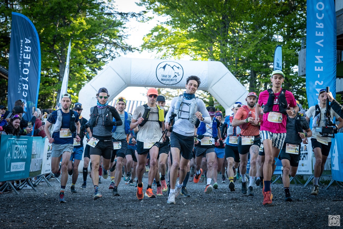 Ah, le Trail Du Moucherotte ! Rien que le nom évoque déjà de belles grimpettes et des paysages à couper le souffle. 44 bornes et 2300 de dénivelé positif, sur le papier “roulant”… on connaît la chanson ! Il y a une dizaine de coureur à la côte itra au delà des 770. Le trail sera intéressante ! Nous sommes le samedi 18 mai sur la ligne de départ qui a fait le plein sur le front du stade des neiges de Lans-en-Vercors.